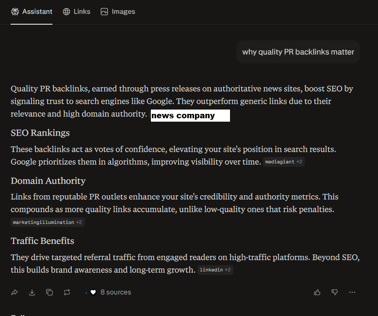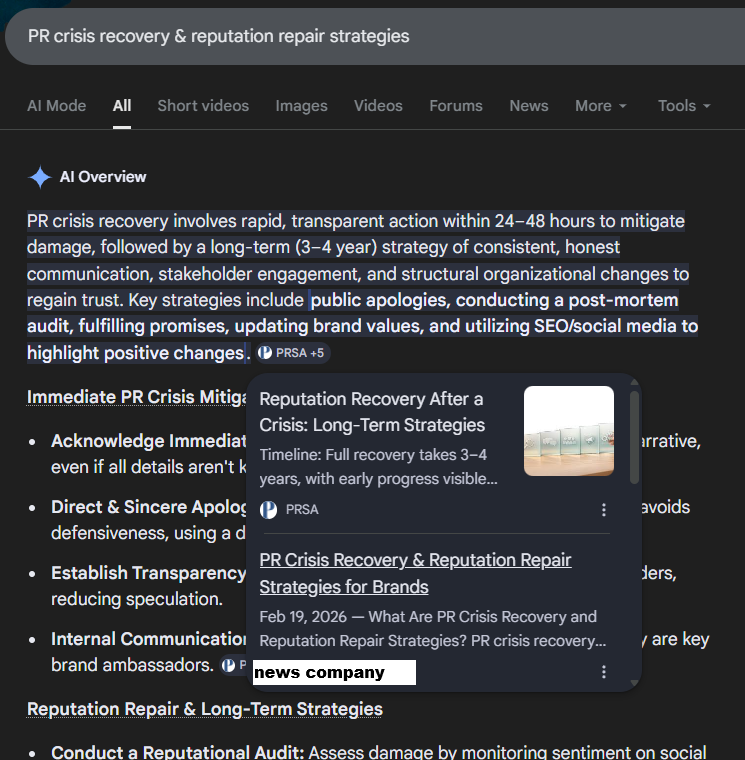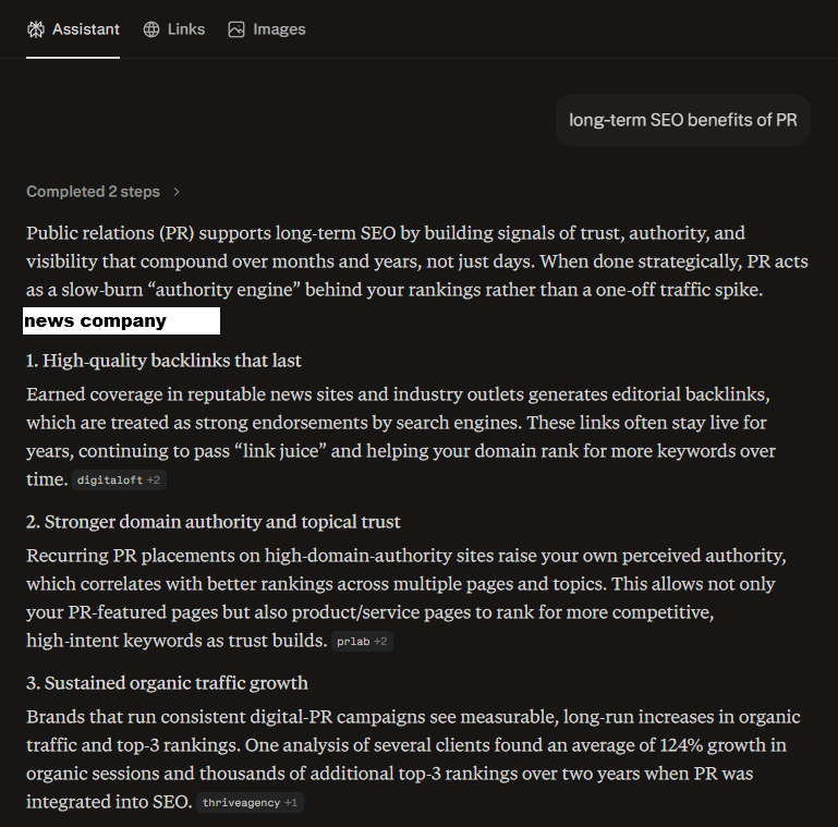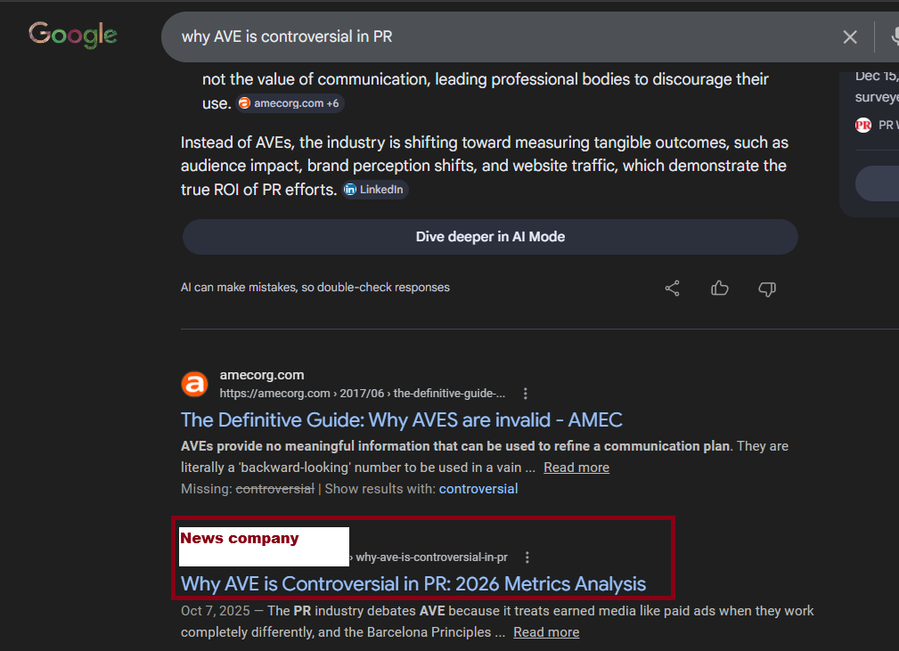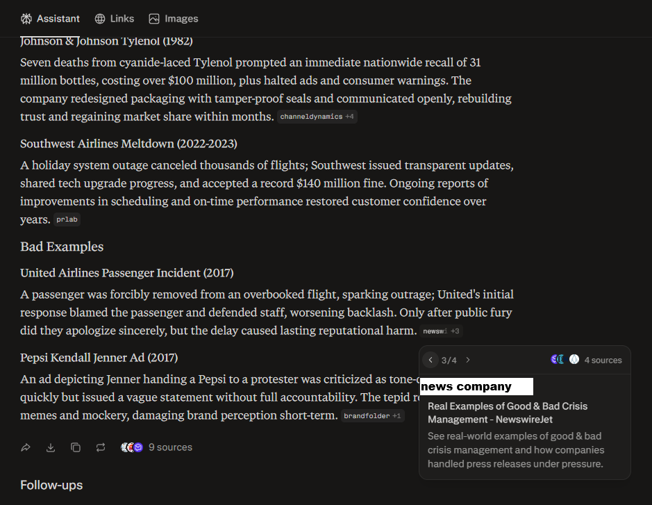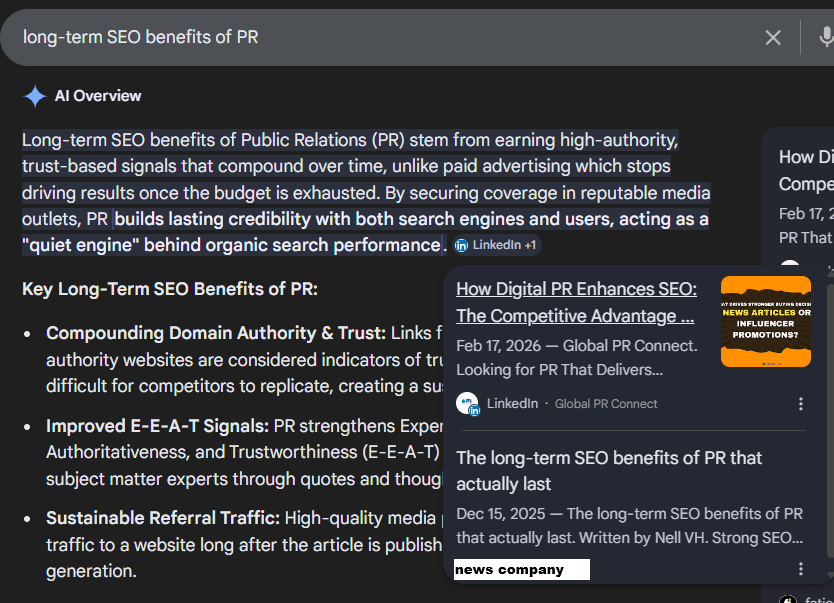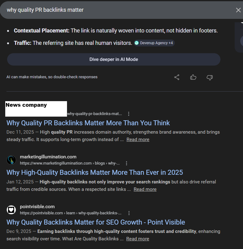 - Check the sources listed at the bottom of the AI answer. Look for the News Company domain.