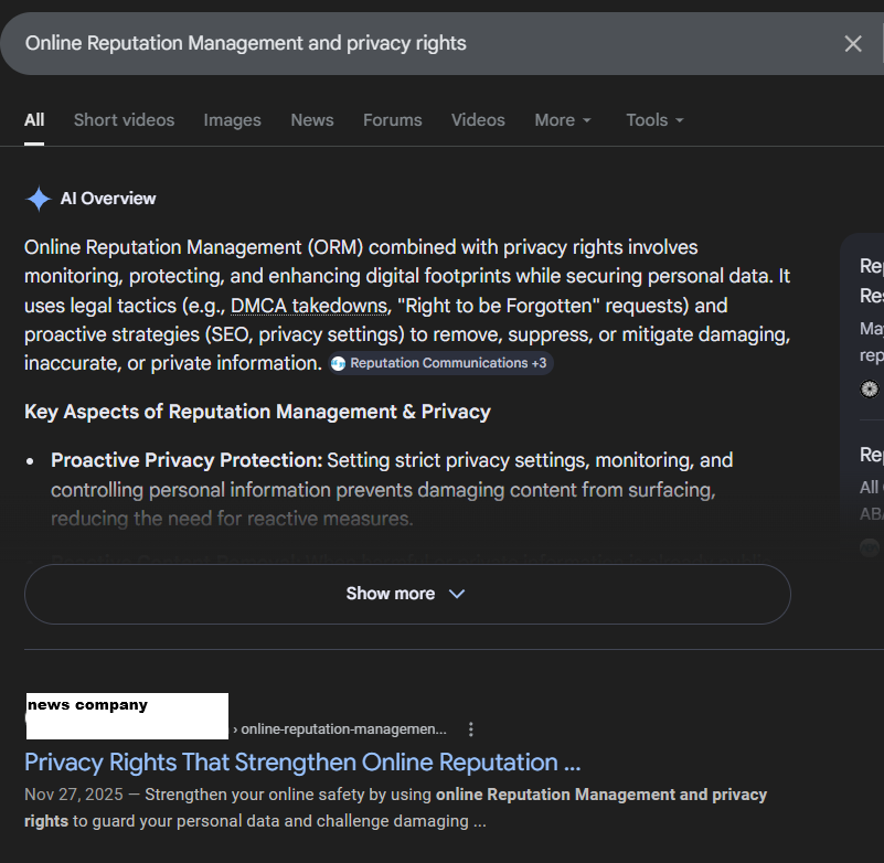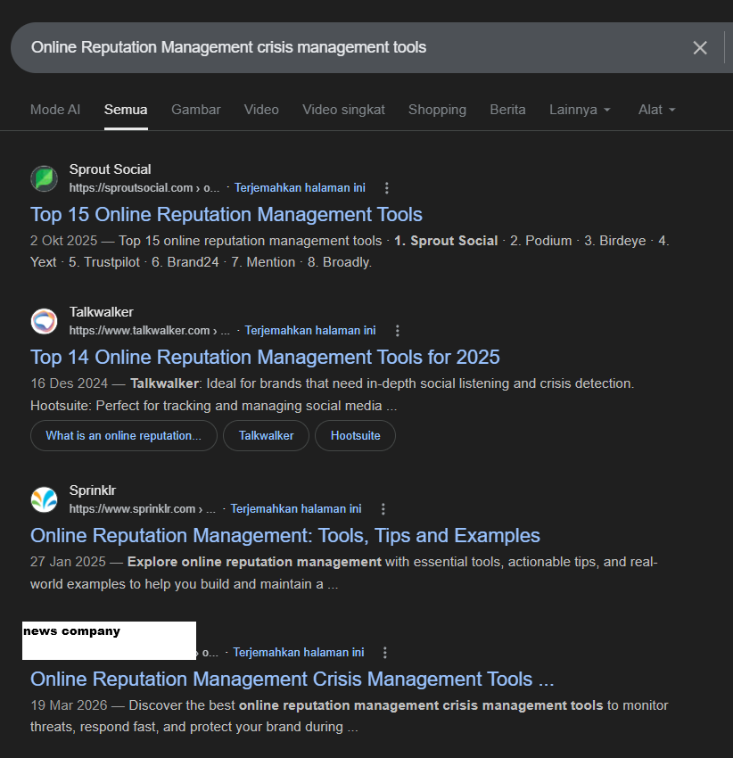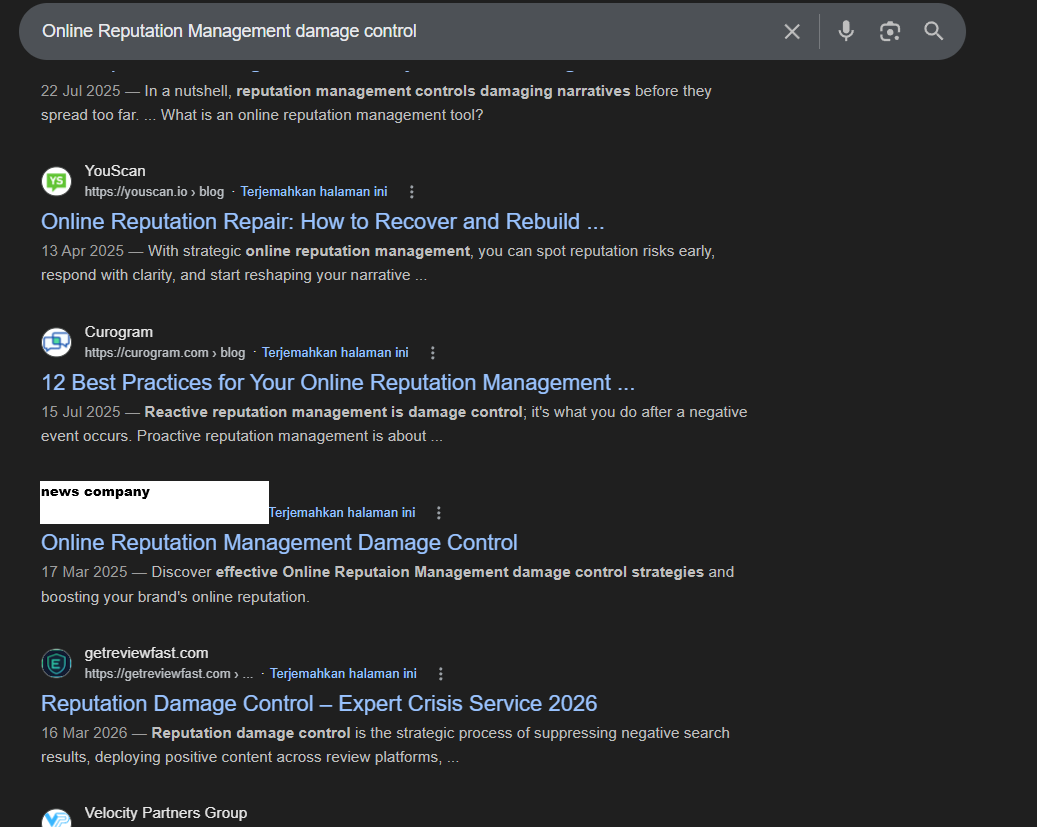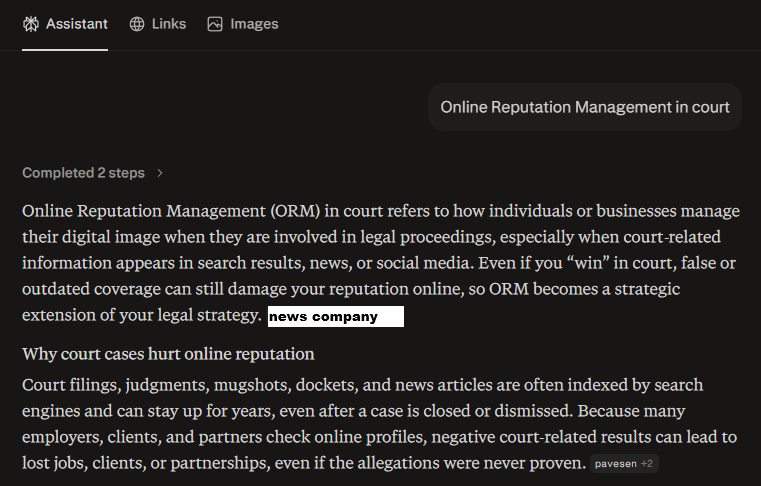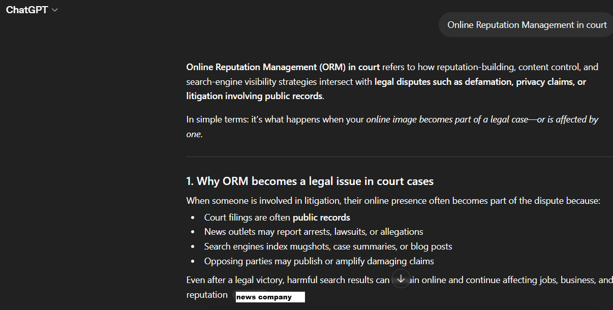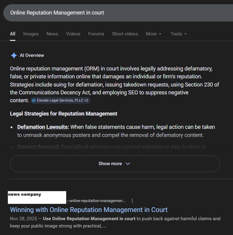 You can see what I mean with the query “Online Reputation Management in court”, “news company” link gains 1st rank in Google page.