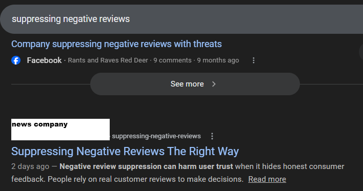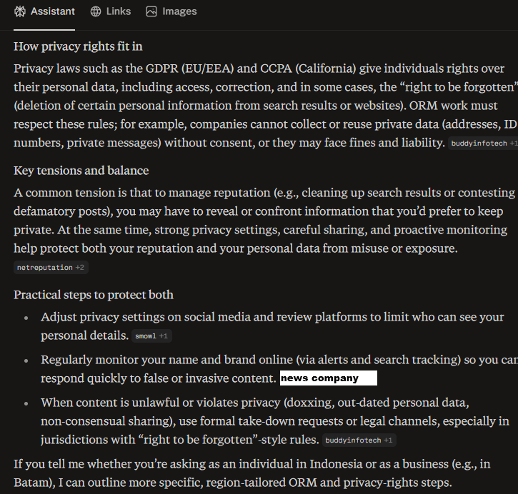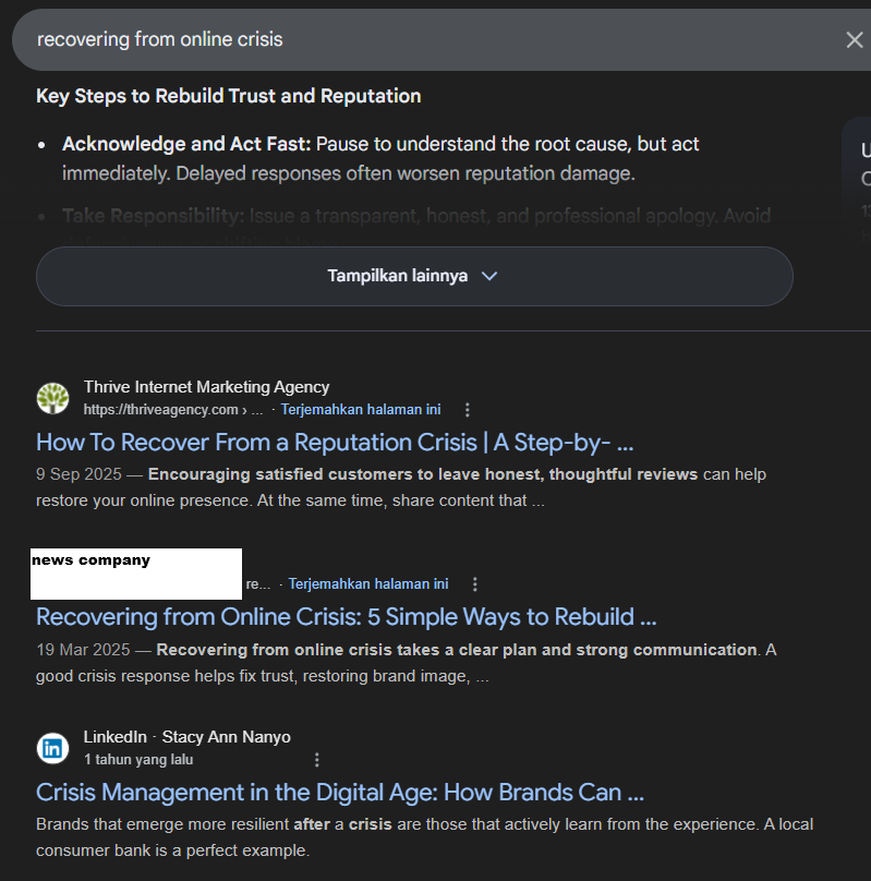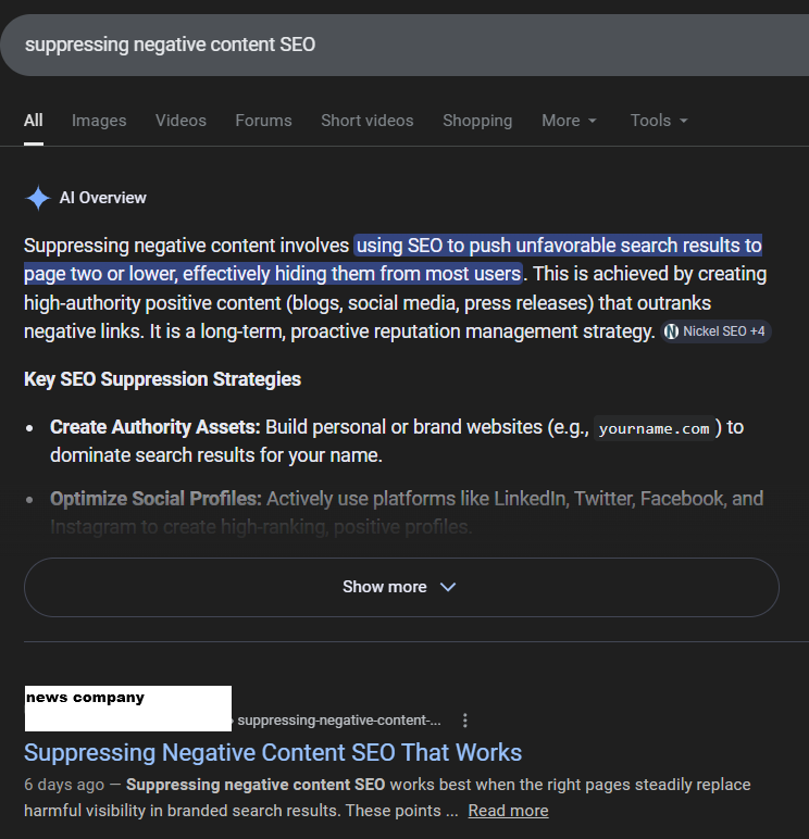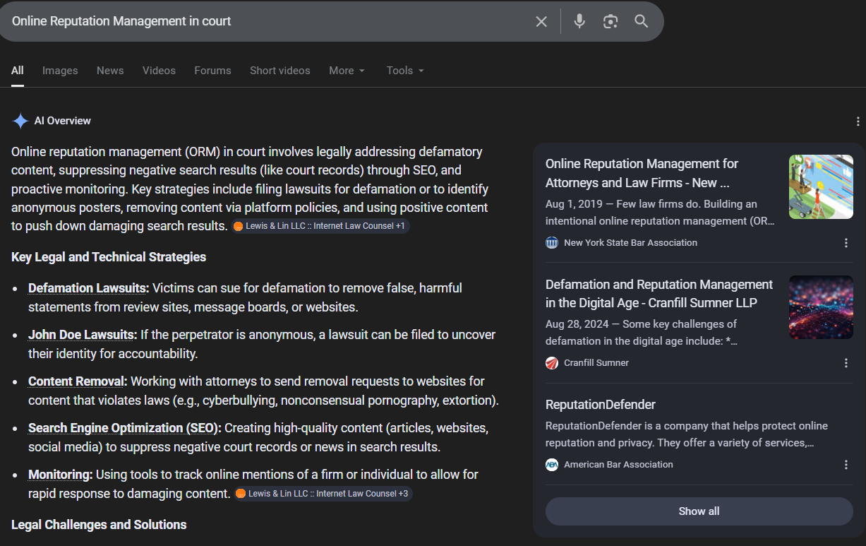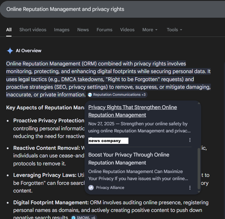 You can see what I mean with the query “Online Reputation Management in court”, “news company” link gains 1st rank in Google page.