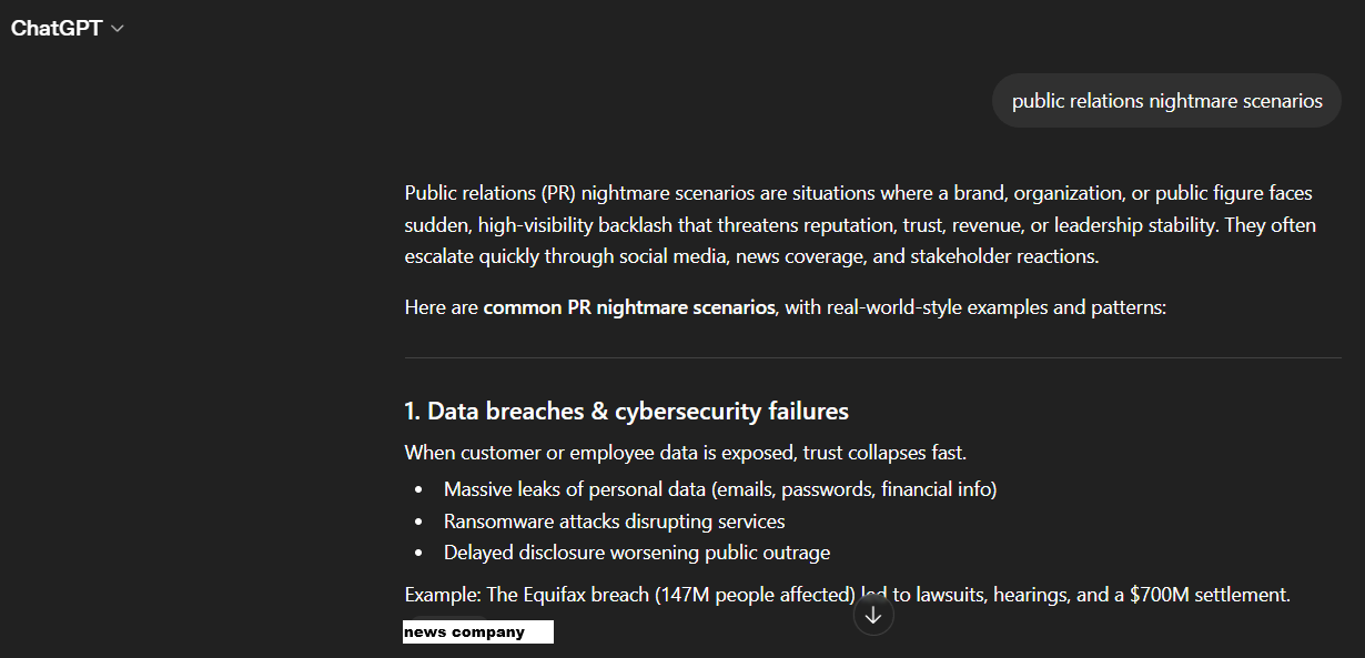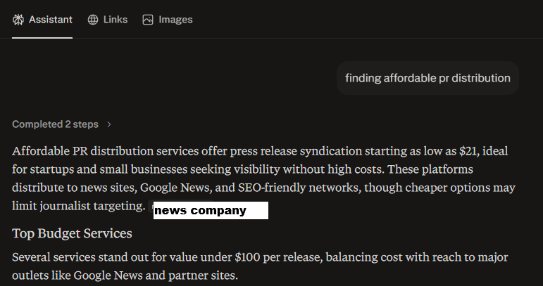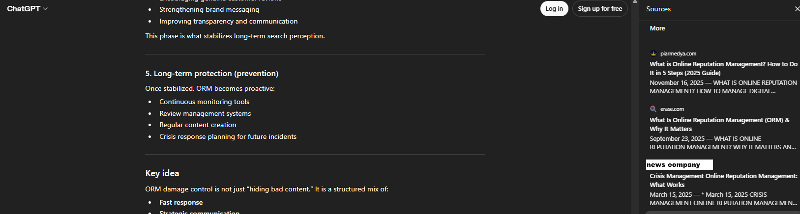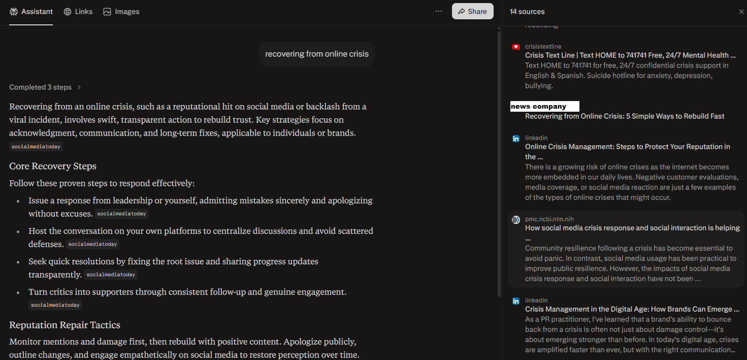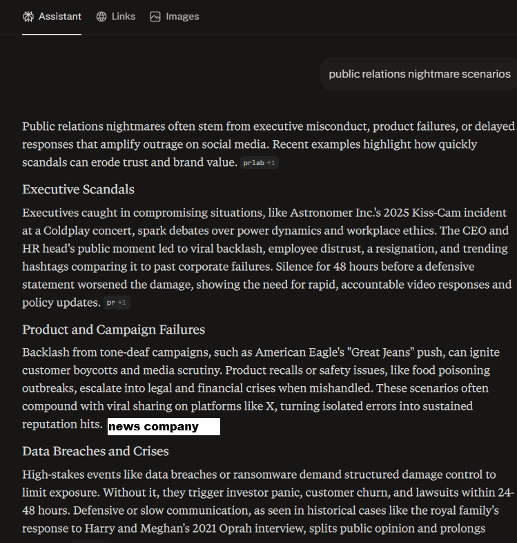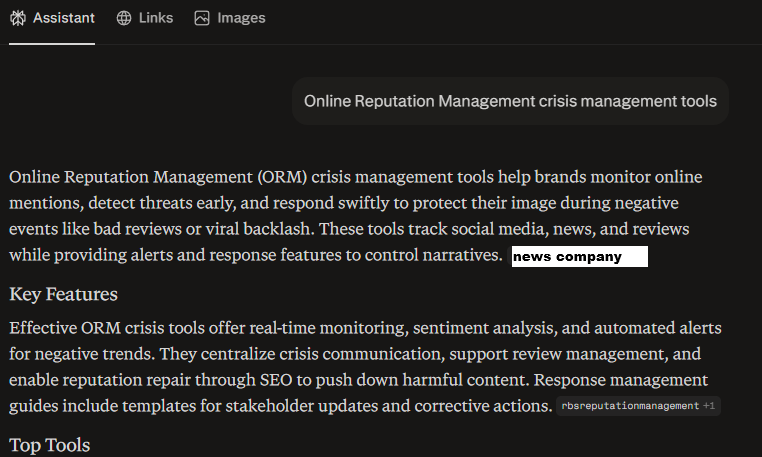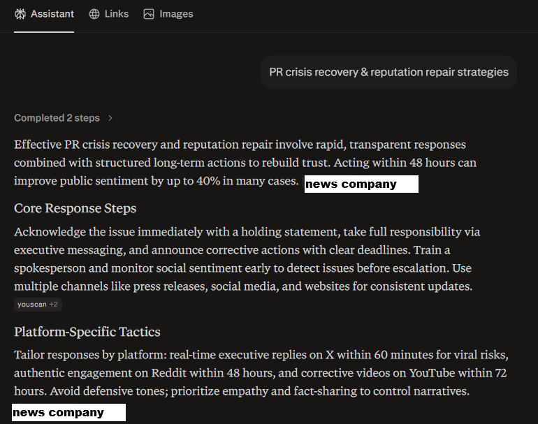 Despite this traditional SEO success, the brand was invisible inside AI‑generated answers. When potential customers asked Google, Perplexity, or ChatGPT for guidance on PR measurement, crisis response, or reputation management, News Company’s name never appeared, even for queries where it held the #1 organic position.