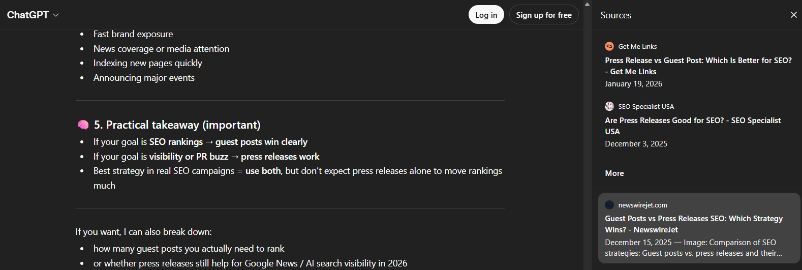 - Open ChatGPT and ask the same questions; note the cited sources.