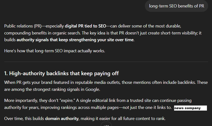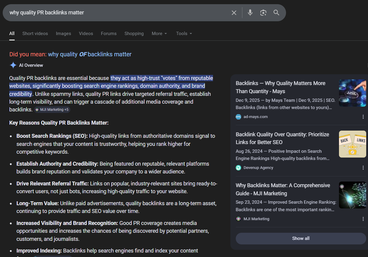 Key Insight: Ranking #1 on Google for “why quality PR backlinks matter” did not earn a citation; Google’s AI Overview ignored the page in favor of a source with clearer formatting. High authority without extractable structure equals zero AI citations.