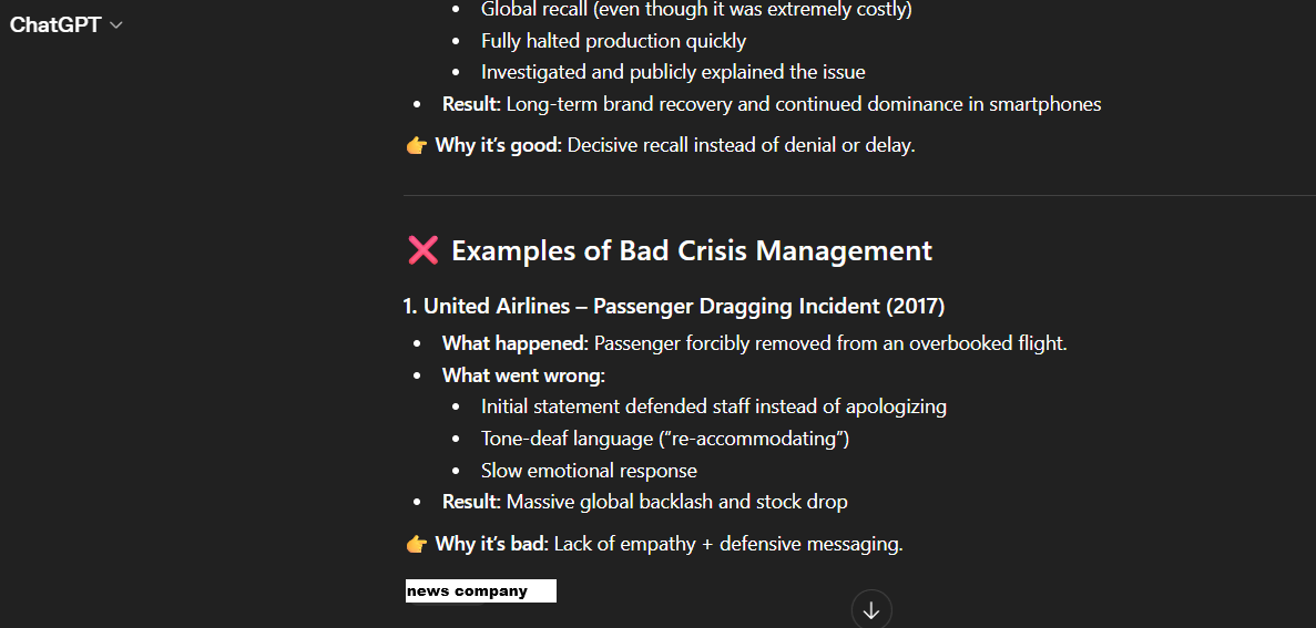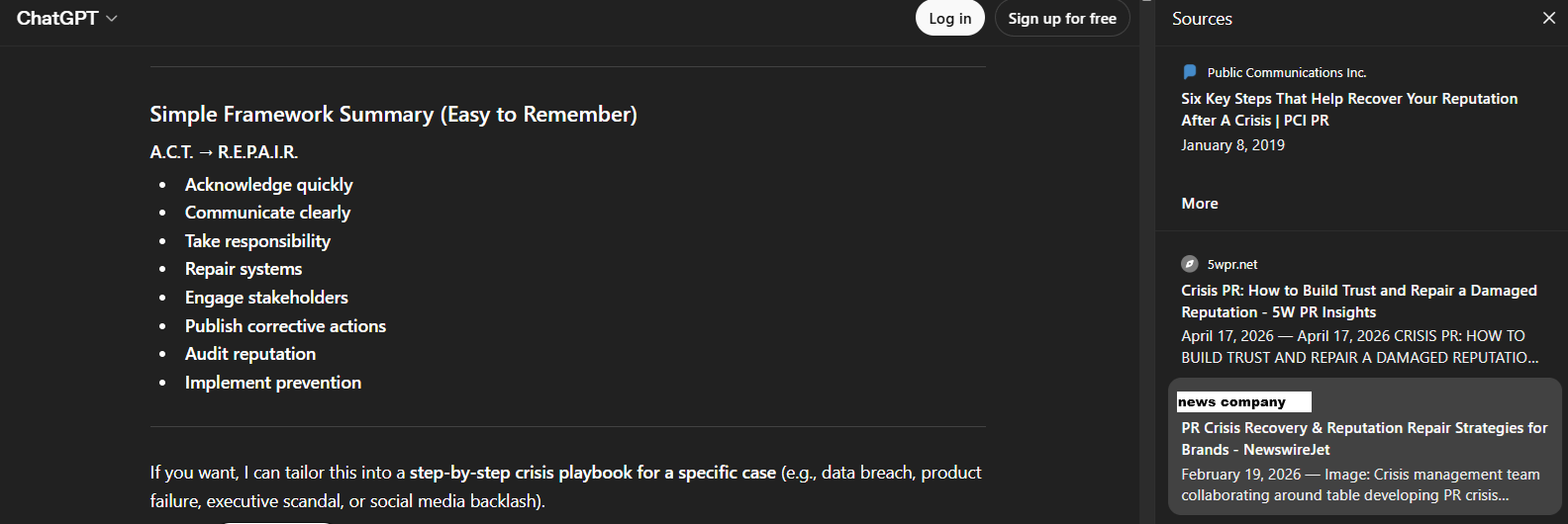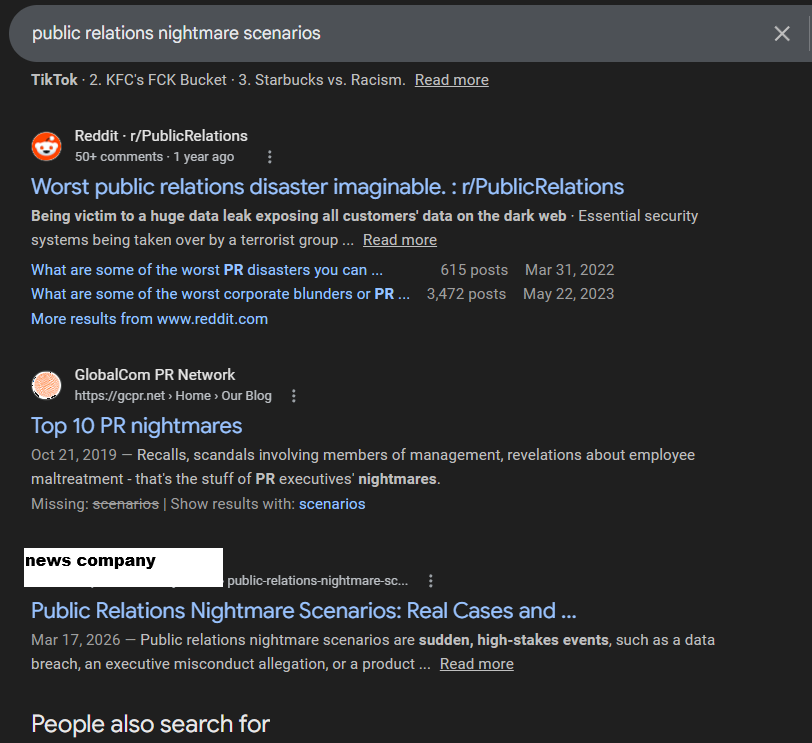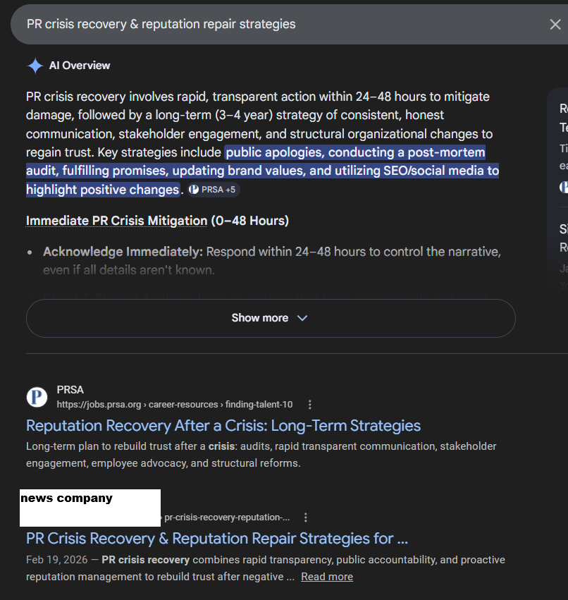 - Mapped 20 informational queries across PR, SEO, crisis, and ORM clusters.