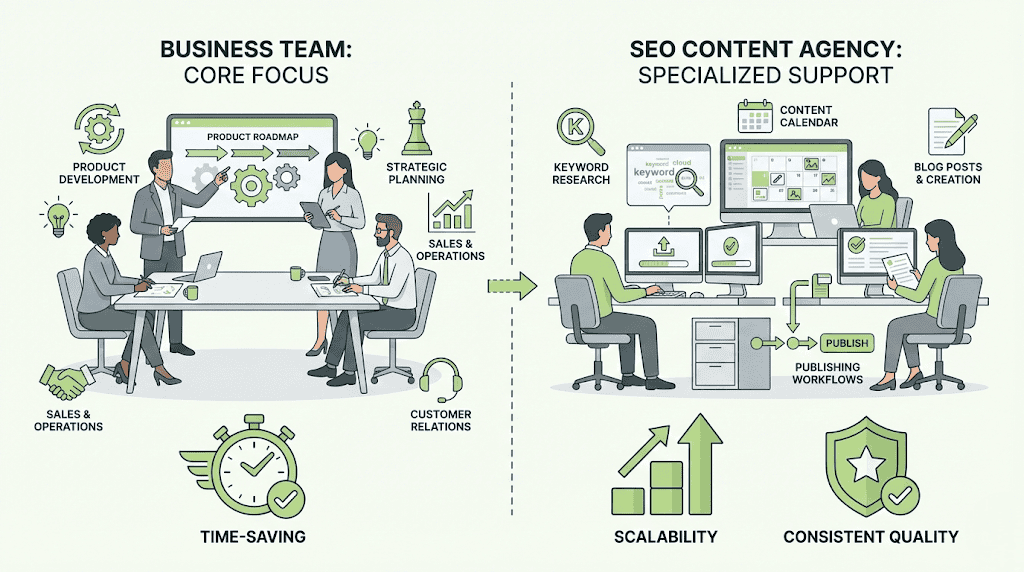 The benefits of using an SEO writing agency come down to one thing: leverage. When a business hires an agency, it taps into systems, people, and strategy that are hard to replicate in house SEO or one-off outsourcing SEO arrangements. Agencies do not just write a blog post or optimize a business profile.