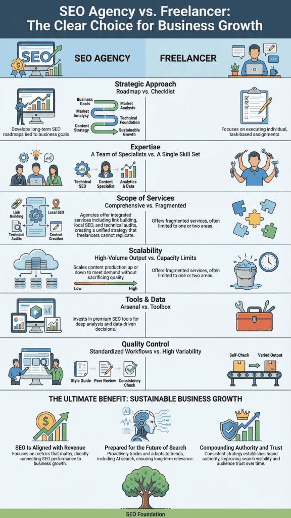 For businesses serious about ranking higher and sustaining growth, agencies provide leverage that freelancers cannot match.