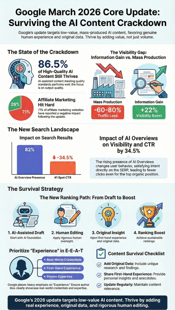 The Google March 2026 Core Update focuses on an AI-content crackdown targeting low-value AI content, scaled content, and generic AI content. It strengthens E-E-A-T enforcement and prioritizes helpful content, original content, and experience-based content. Sites using AI-assisted content must ensure human-edited AI content meets search intent, adds information gain, and avoids thin content or unhelpful content.