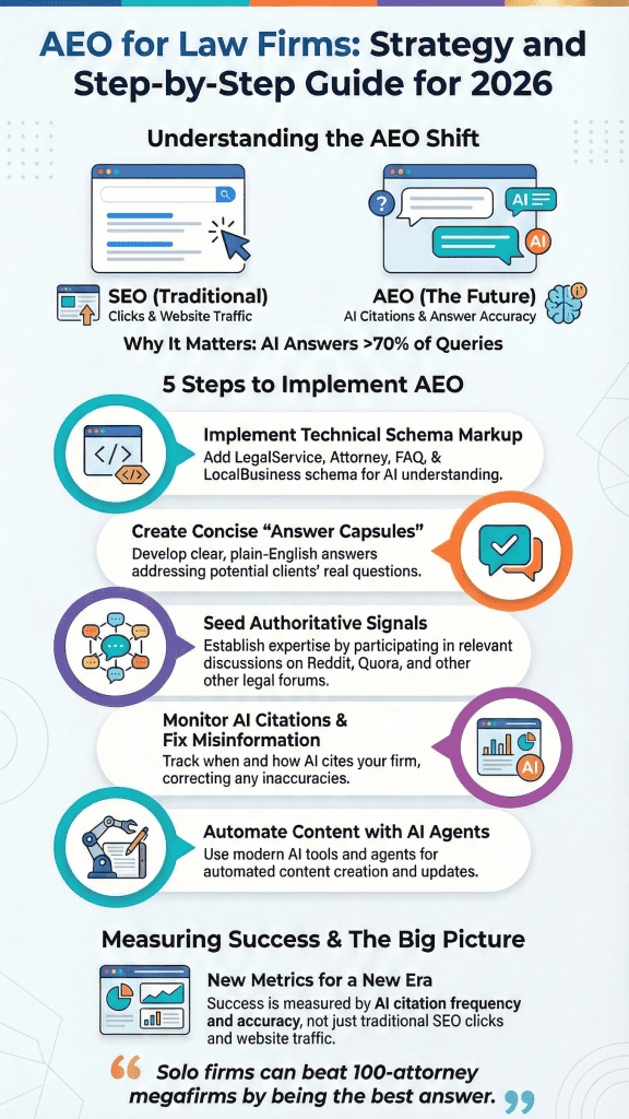 Want to know the best part about AEO? It doesn’t reward the biggest firm. It rewards the best answer. That means a solo practitioner who answers questions clearly, with citations and reviews, can beat out a 100-attorney mega firm with a vague, keyword-stuffed website. – IFTS Design [2]