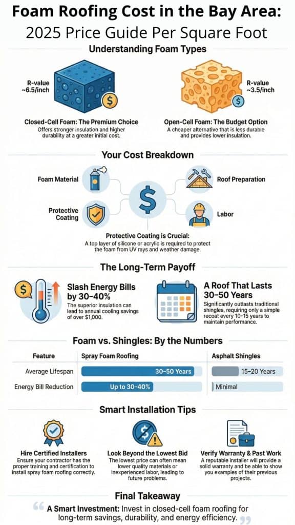 The foam roofing cost price depends on your roof’s size, the foam type you pick, and the specific labor rates here in the Bay Area. It might seem like a significant outlay at first. But for California homeowners, this roof pays you back.