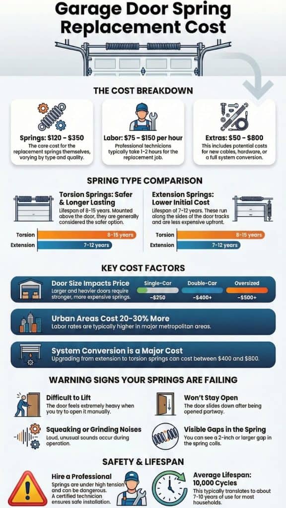 - System Conversion: Switching from extension to torsion springs costs $400-$800.