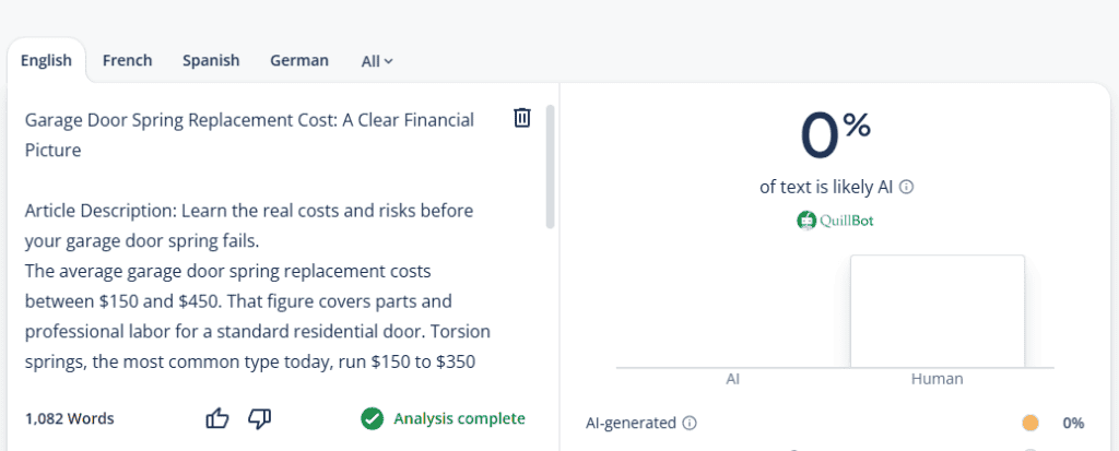 | Spring Replacement Cost | Average Price Range | $150–$350 (torsion), $120–$200 (extension) | 10 | Core intent of the topic; users search specifically for price ranges. |