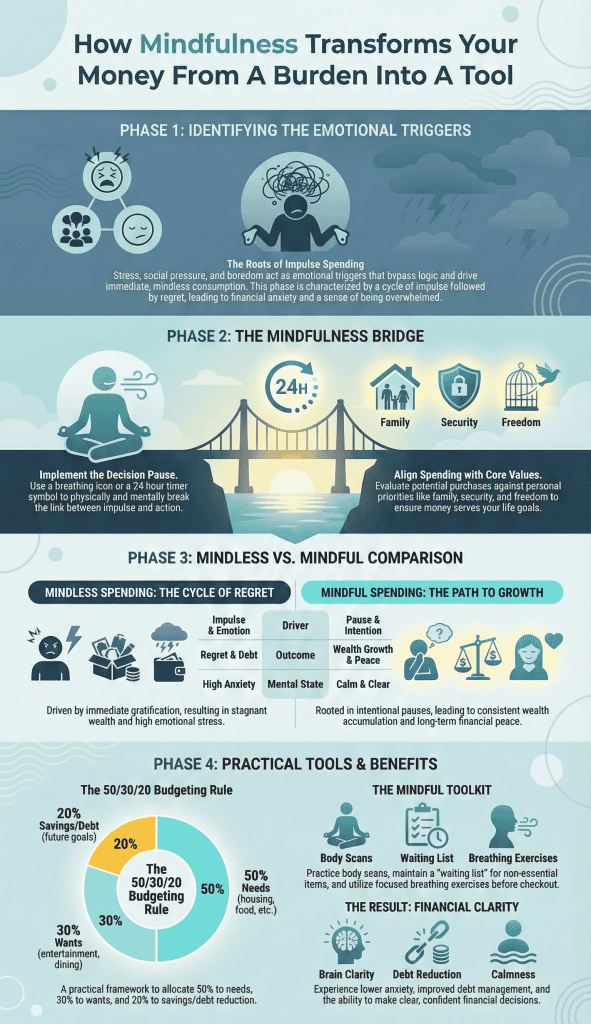 Financial mindfulness is the practice of maintaining a non-judgmental, present-moment awareness of your money habits and emotional triggers. It transforms reactive spending into intentional decision-making by creating space between impulse and action.