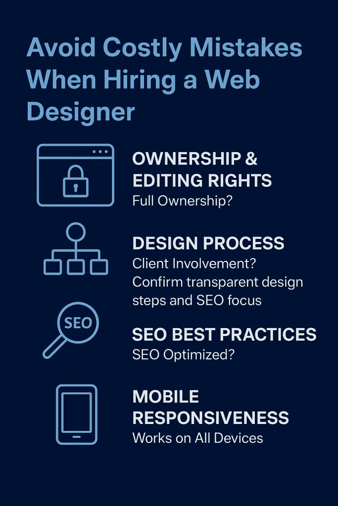 When you hire someone, you want to keep control. That means owning your domain, hosting, and content. If you don’t ask, you might find yourself locked in, paying fees or needing the designer’s help for every little change.
