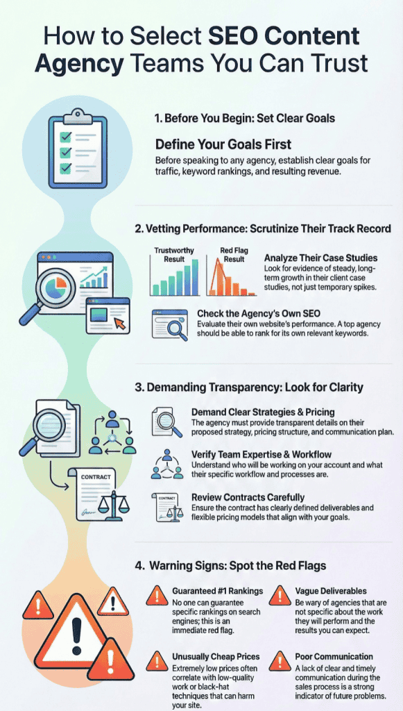 Start with a clear SEO agency selection process based on your needs. Use an SEO firm evaluation criteria list covering industry experience, content strategy agency review, and content creation team expertise. A good content agency hiring guide focuses on business goal alignment, transparent SEO agency practices, and realistic SEO ROI measurement, not promises of instant rankings.