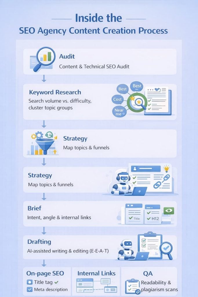 Agencies focus on E-E-A-T compliance and adapt content to Google core updates. This involves a content audit process, competitor content gap review, and quality assurance checks. Writers use readability analysis, plagiarism detection tools, and Flesch score improvement to keep content clear. Human editor review ensures tone consistency, accuracy, and trust signals that support long-term search visibility.